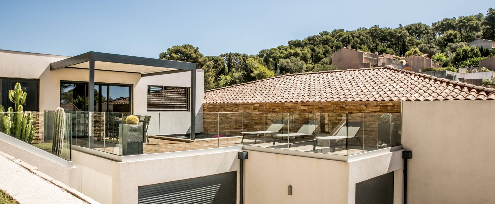 Nous avons posé une pergola bioclimatique en aluminium à lames orientables de marque SOLISYSTEME à Cassis dans les Bouches-du-Rhône. Elle est composée d'une structure grise anthracite et de lames orientables de couleur blanche.