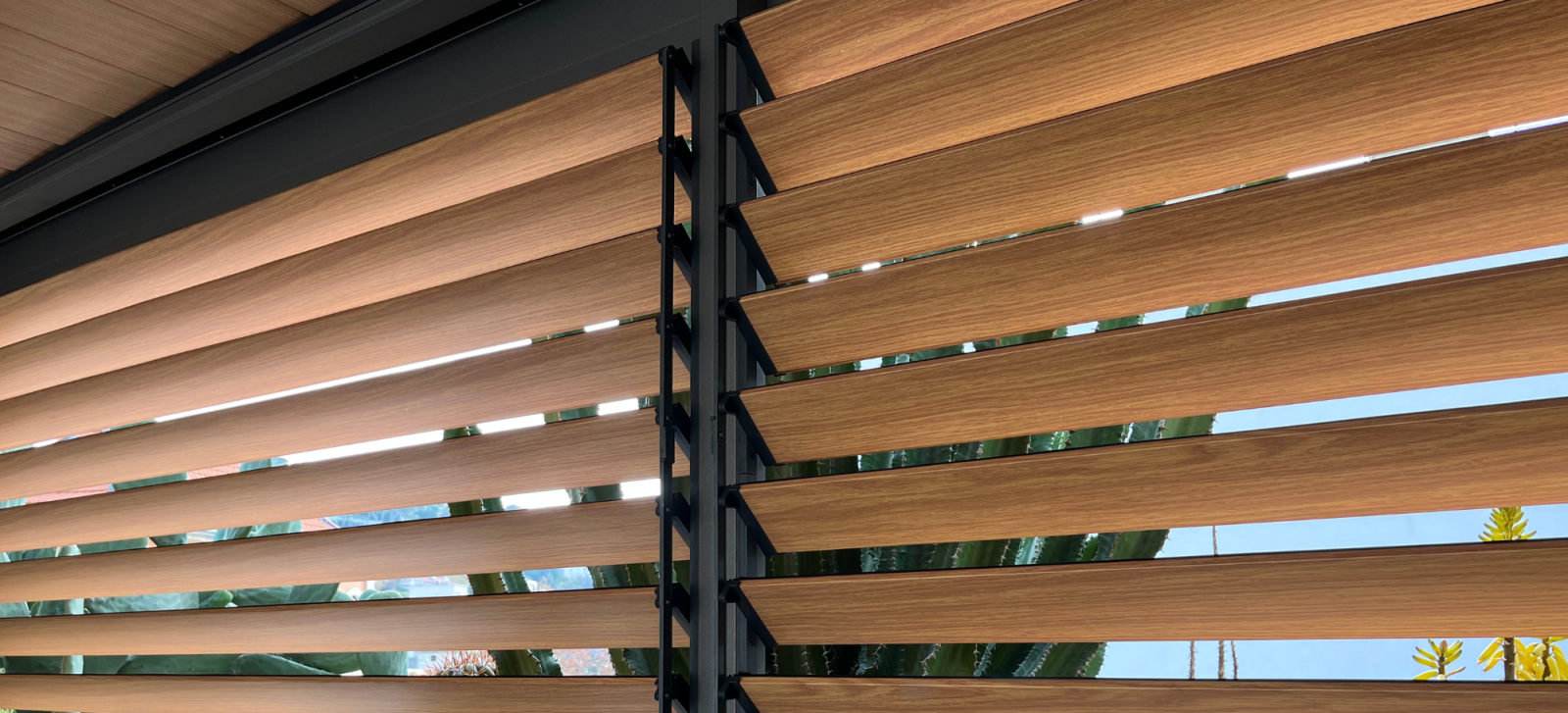Nous sommes les seuls fabricants au monde à proposer des brise-soleil orientables avec une finition sublimation bois en aluminium sur nos pergolas bioclimatiques et carports.
