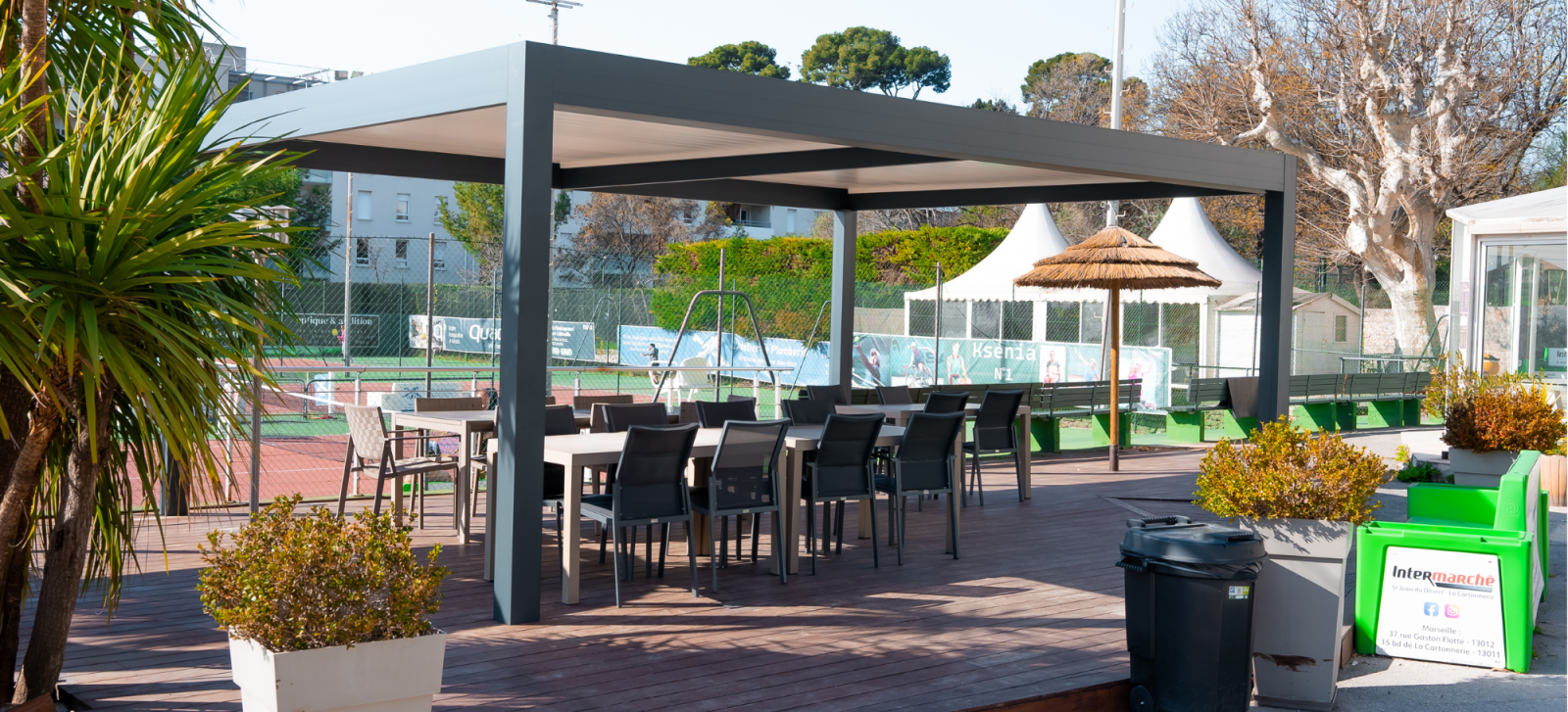 De plus, l'aspect moderne et élégant de la pergola attire une clientèle désireuse de profiter d'un repas en plein air dans un cadre confortable et esthétique, renforçant ainsi la fidélisation et les bénéfices.
