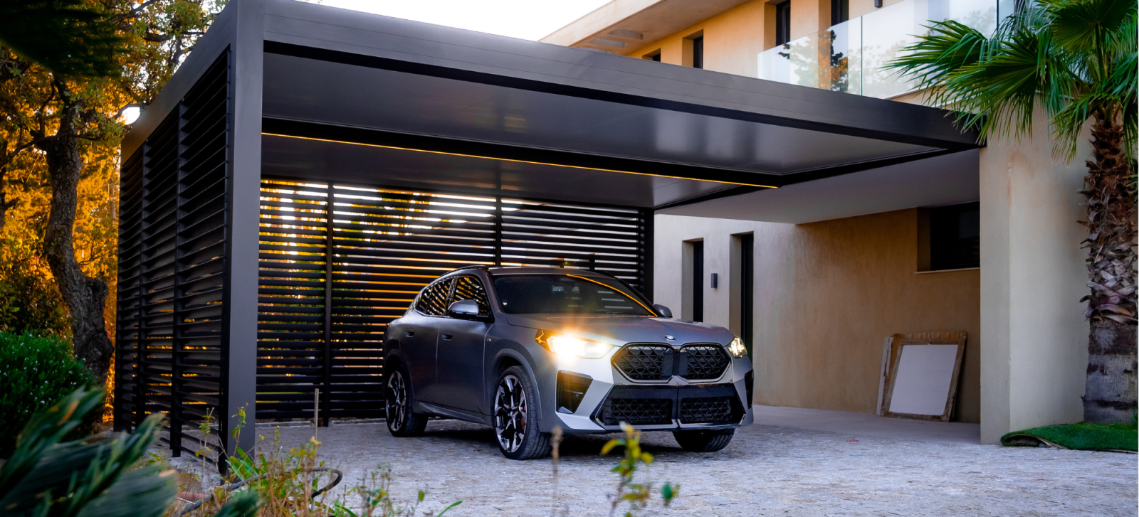 Grâce à ses fermetures latérales et ses bandeaux LED intégrés, cet abri voiture allie fonctionnalité et esthétisme.