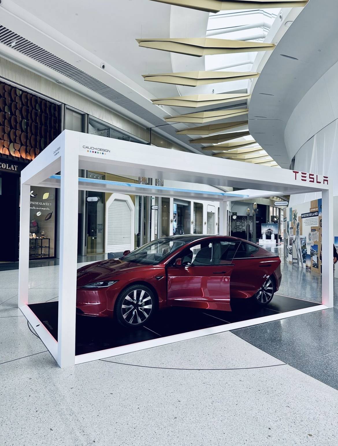 Grâce à cette installation, les visiteurs ont pu découvrir un espace sophistiqué et fonctionnel, parfaitement adapté à la présentation des modèles électriques Tesla. Ce partenariat illustre notre engagement en faveur de solutions toujours plus modernes et respectueuses de l’environnement.